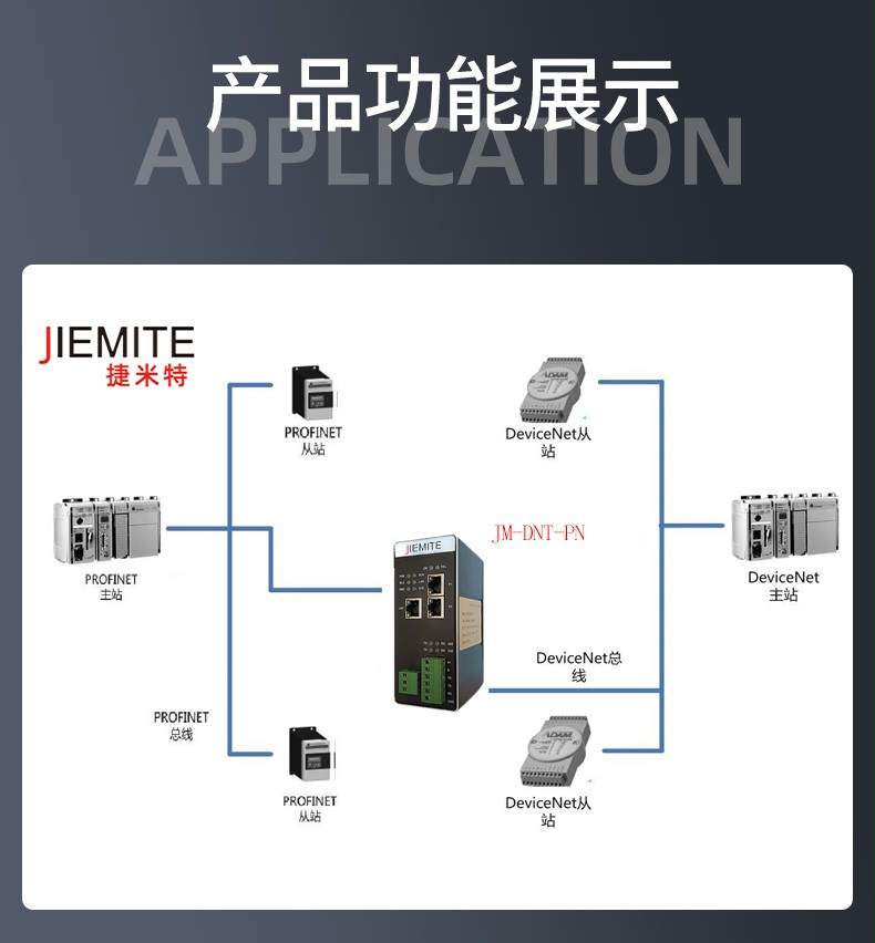 JM-DNT-PN 是自主研發(fā)的一款 PROFINET 從站功能的通訊網(wǎng)關(guān)。該產(chǎn)品主要功能是將 PROFINET 網(wǎng)絡(luò)和 DeviceNet 網(wǎng)絡(luò)連接起來。