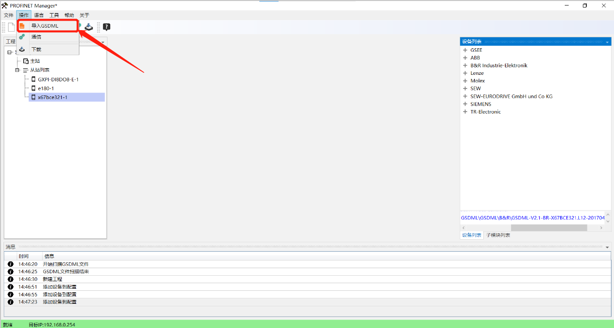 · 將PROFINET從站GSDML文件復制至軟件安裝路徑下的GSDML文件夾中,例如:C:\ProgramFiles(x86)1PROFINETManager\GSDML或者通過菜單欄“選項”中的“操作”選擇導入GSDML實現(xiàn)GSDML加載;點擊“導入GSDML”彈出“選擇導入的文件”對話框,查找GSDML的路徑文件打開即可;或者點擊