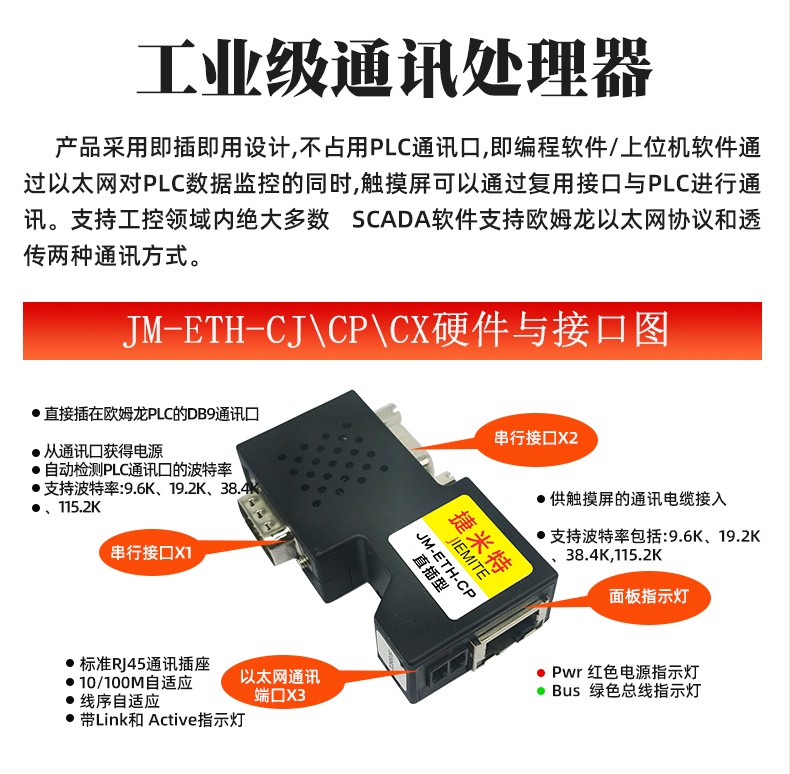 JM-ETH-CP 采用即插即用設(shè)計,不占用 PLC 通訊口,即編程軟件/上位機軟件通過以太網(wǎng)對 PLC 數(shù)據(jù)監(jiān)控的同時,觸摸屏可以通過復(fù)用接口與 PLC 進行通訊。JM-ETH-CP 支持工控領(lǐng)域內(nèi)絕大多數(shù) SCADA 軟件,支持歐姆龍以太網(wǎng)協(xié)議和透傳兩種通訊方式。