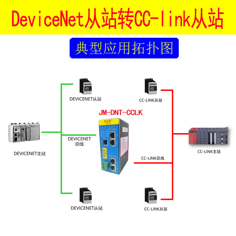 捷米特JM-DNT-CCLK網(wǎng)關(guān)連接到 CC-LINK 總線中作為從站使用,連接到 DEVICENET總線中作為從站使用。即可以實(shí)現(xiàn)DEVICENET接口儀表、變頻器、綜保、軟啟動(dòng)器或施耐德PLC等設(shè)備接入到三菱的CC-LINK 網(wǎng)絡(luò)系統(tǒng)。