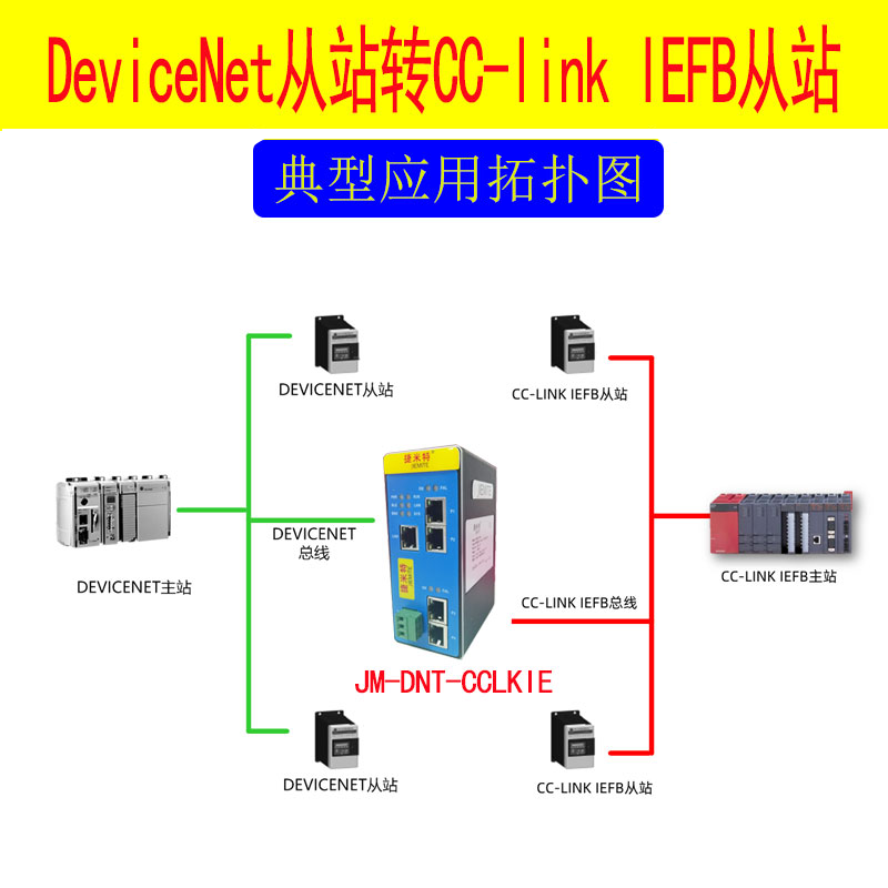 捷米特JM-DNT-CCLKIE網(wǎng)關(guān)連接到 CC-LINK IEFB總線中作為從站使用,連接到 DEVICENET總線中作為從站使用。即可以實(shí)現(xiàn)DEVICENET接口儀表、變頻器、綜保、軟啟動(dòng)器或施耐德PLC等設(shè)備接入到三菱的CC-LINK IEFB網(wǎng)絡(luò)系統(tǒng)。