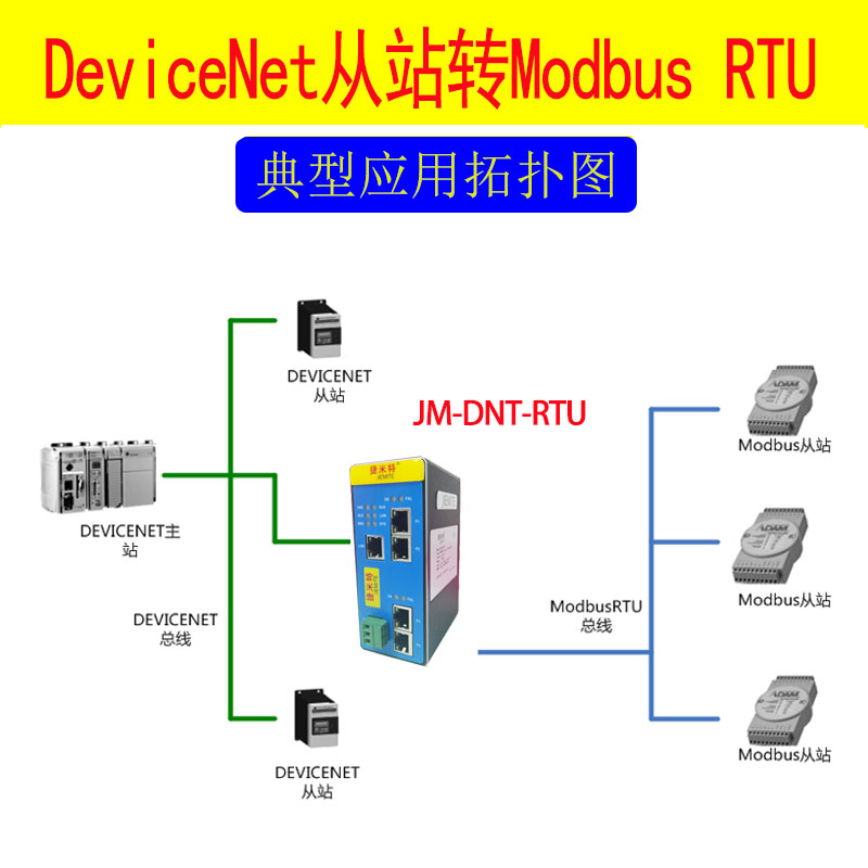 捷米特JM-DNT-RTU網(wǎng)關(guān)實(shí)現(xiàn)MODBUS RTU轉(zhuǎn)DeviceNet功能,能夠?qū)崿F(xiàn)Modbus RTU接口儀表、變頻器、綜保、軟啟動(dòng)器等設(shè)備接入到DeviceNet的PLC或者DeviceNet網(wǎng)絡(luò)系統(tǒng)。