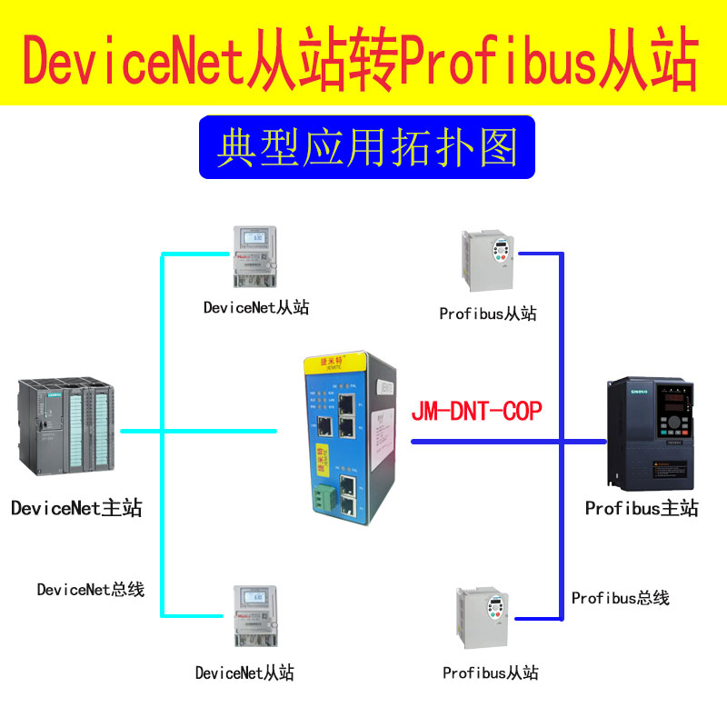 捷米特JM-DP-DNT網(wǎng)關(guān)連接到Profibus DP總線中作為從站使用,連接到DeviceNet總線中作為從站使用。