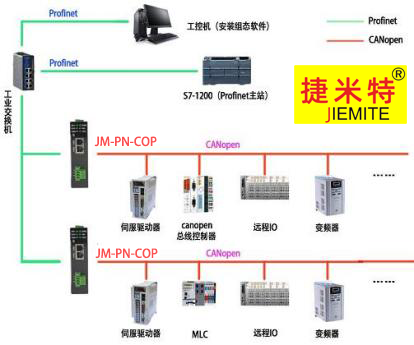捷米特 JM-PN-COP在 PN 側(cè)作為 PN IO 從站,接西門子 PLC;在 COP 側(cè)做為 COP 主站,接 COP 設(shè)備,如伺服、變頻器、電機(jī)等。